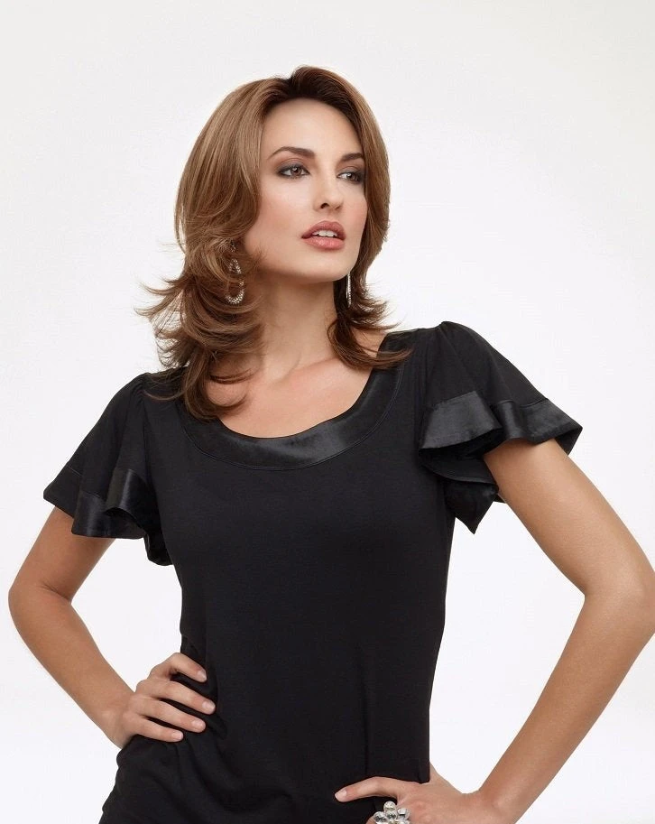 Rylee by Envy offers contemporary styling in a fashionable layered cut. With its long, fringed bangs and soft, flipped out layers, Rylee is a trendsetting winner. Lace Front Mono Top construction gives the appearance of the fibers growing directly from your own scalp. Believable and natural from any angle, so the only thing noticed is great style!