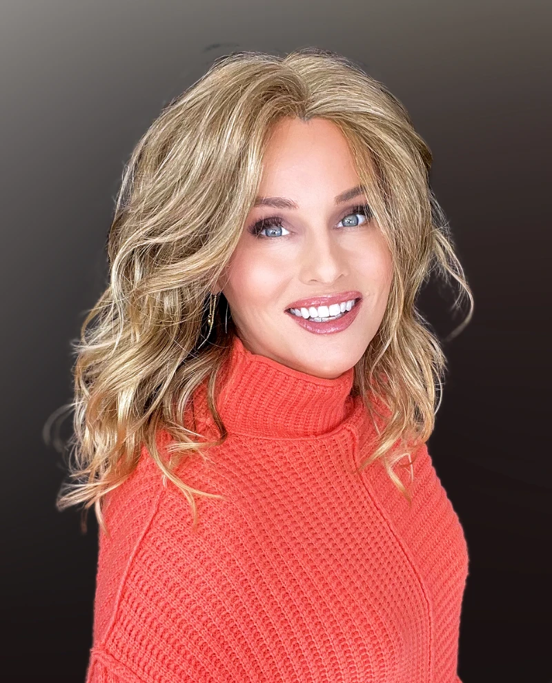 Showgirl by Mane Attraction is flirty and fun! The lace front and lace mono part allows for a natural-looking center part and off-the-face styling. This stylish look features a sleek, long curtain fringe that flows into soft curls throughout.Â
