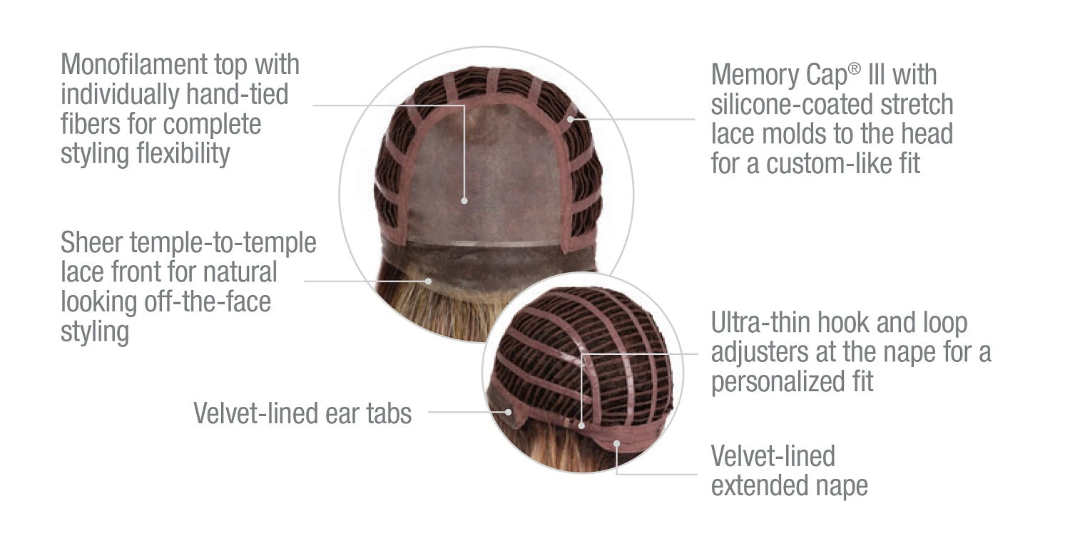 Unstructured. Understated. Undeniably sexy. Layered length with a natural wave is your ticket to full membership in the club where fashion is fabulous and so much fun. Style half-up half-down. The hand-tied top and temple-to-temple lace offer beautiful versatility.